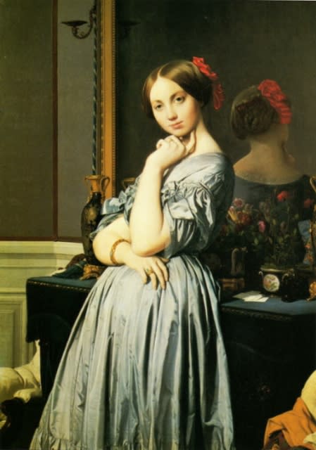 アングルは、1842年にこの肖像画の制作に着手しますが、その完成までには幾多の試行錯誤を重ね、顎のあたりまで上げた左腕や頭部、鏡に映った後ろ姿の原寸大の習作をはじめとする数多くのデッサンを繰り返し描きました。